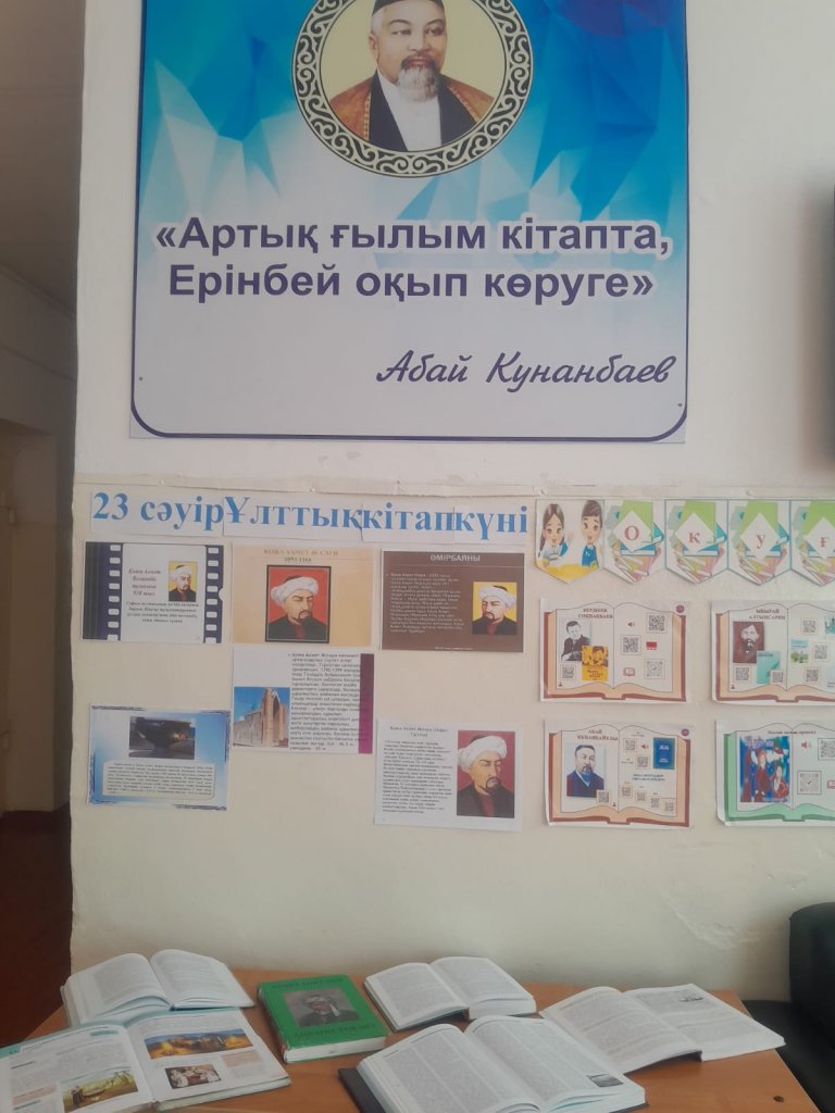 "Ғылымға апарар жол ", "Қожа Ахмет Яссауиға Өнегең мен ұлысың ұлы баб" тақырыбында көрме ұйымдастырылды."Менің сүйікті журналым" жас Оқырмандарды қызықты журналдармен таныстыру. "Цифрлық әлеммен таныстыру" Бүгінгі таңда кітап пен Цифрлық әлем-бір-бірін толықтыратын қос құндылық ."Отбасылық кітап оқу-игі дәстүр" Оқушыларға отбасы болып кітап оқудың маңызын түсіндіру, кітапқа деген қызығушылығын арттыру.